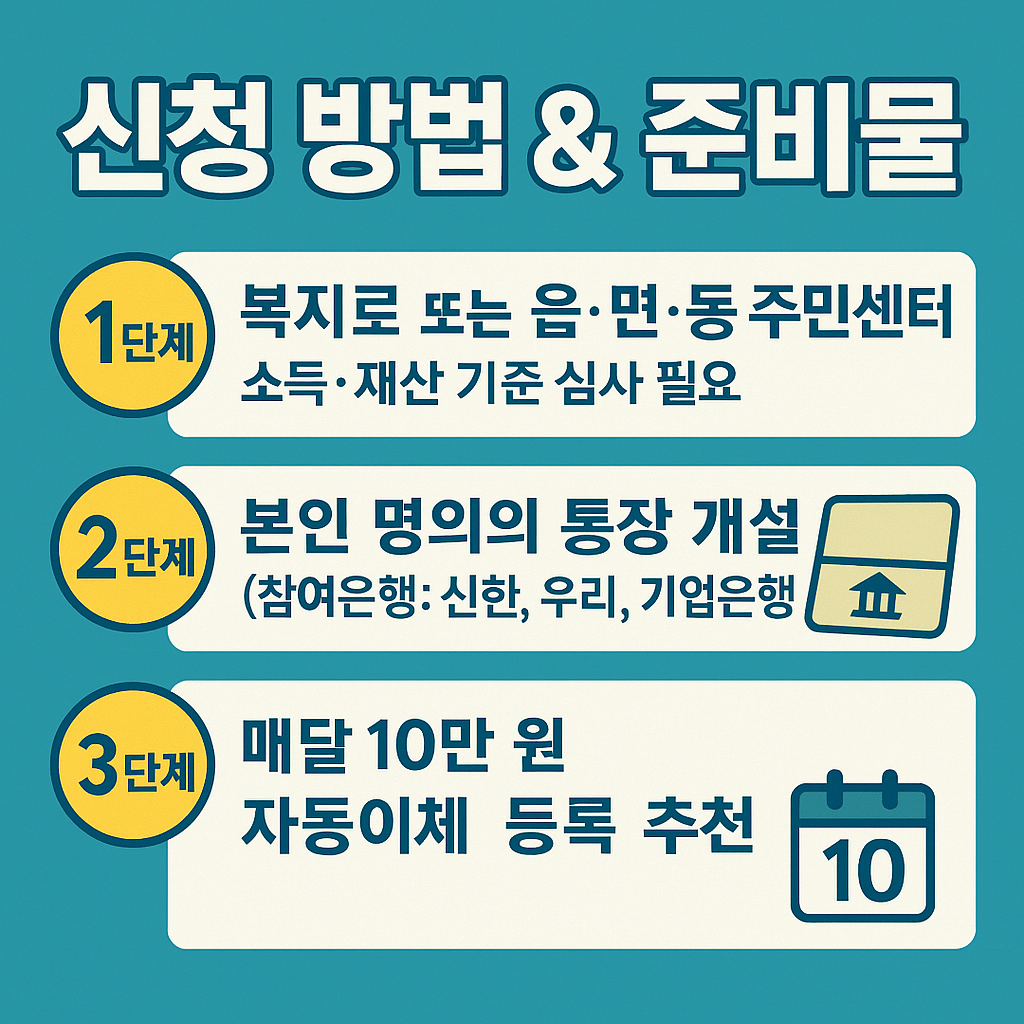 소득·재산 기준 심사 필요 - 2단계 – 계좌 개설: 본인 명의의 통장 개설 (참여은행: 신한, 우리, 기업은행 등)