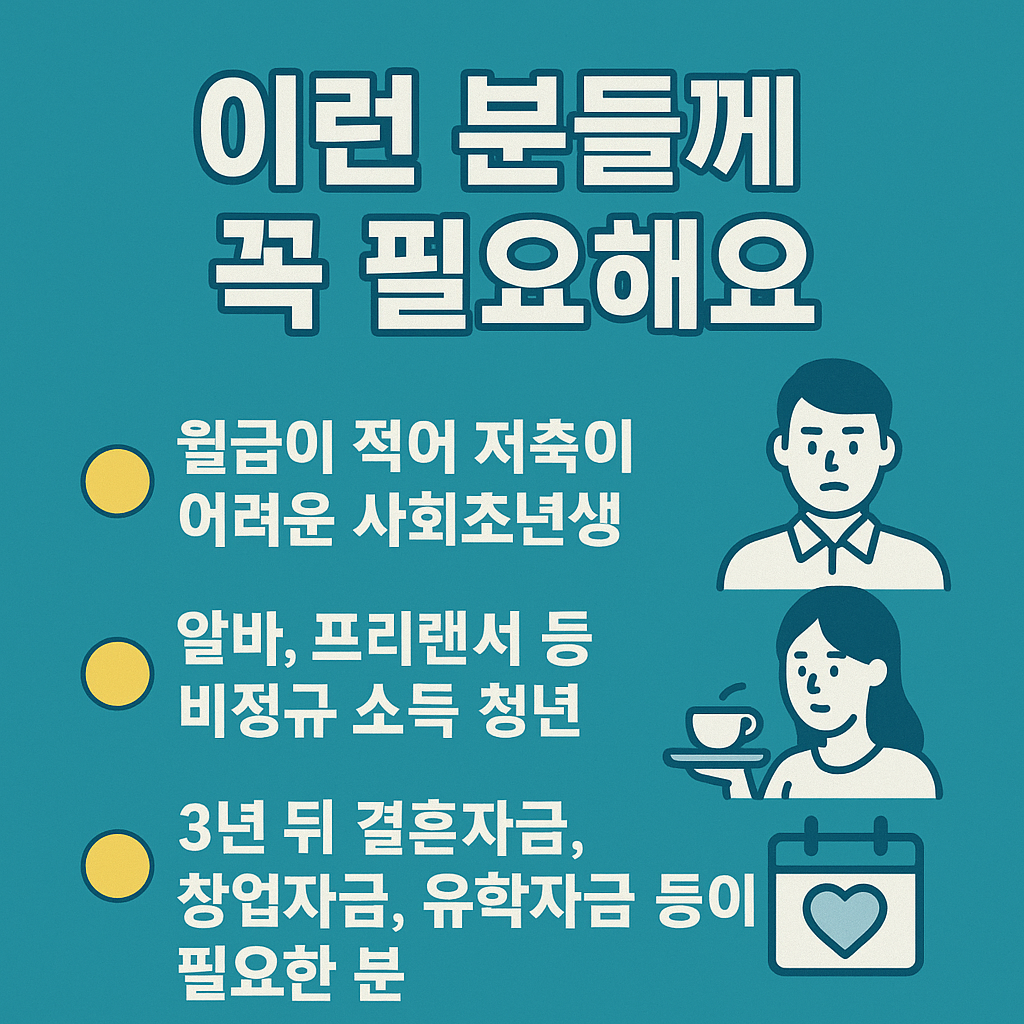 정부는 소득이 낮은 청년들이 자립할 수 있도록 자산형성 기회를 주기 위해 이 계좌를 만들었어요. 일정 소득 이하의 청년이 3년 동안 꾸준히 납입하면, 정부가 조건에 맞춰 추가 지원금을 얹어주죠.