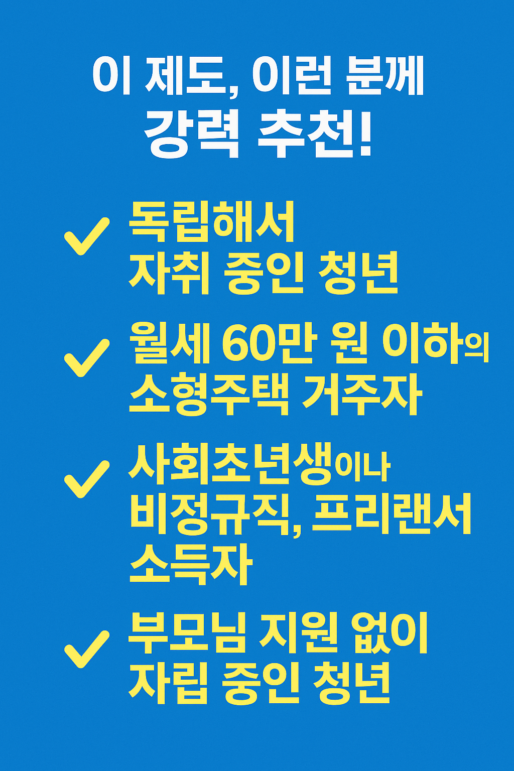 ✔️ 독립해서 자취 중인 청년 ✔️ 월세 60만 원 이하의 소형주택 거주자 ✔️ 사회초년생이나 비정규직, 프리랜서 소득자 ✔️ 부모님 지원 없이 자립 중인 청년