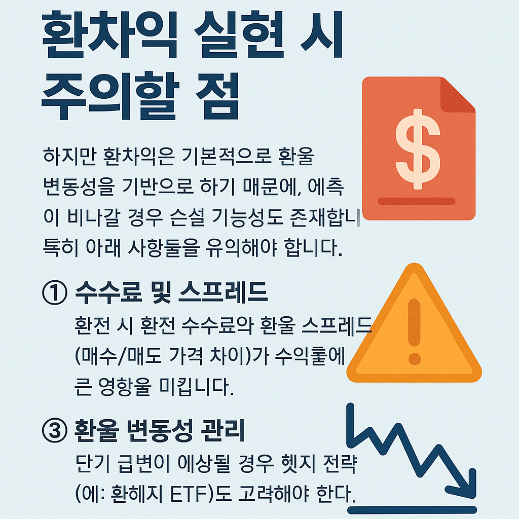 하지만 환차익은 기본적으로 환율 변동성을 기반으로 하기 때문에, 예측이 빗나갈 경우 손실 가능성도 존재합니다. 특히 아래 사항들을 유의해야 합니다.