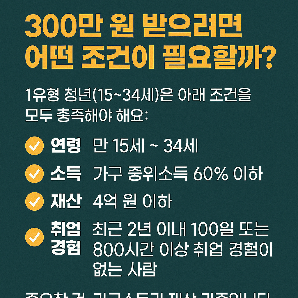 1유형 청년(15~34세)은 아래 조건을 모두 충족해야 해요: