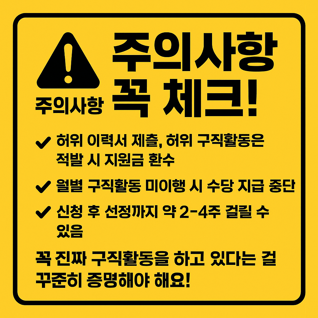 ✔️ 허위 이력서 제출, 허위 구직활동은 적발 시 지원금 환수 ✔️ 월별 구직활동 미이행 시 수당 지급 중단 ✔️ 신청 후 선정까지 약 2~4주 걸릴 수 있음