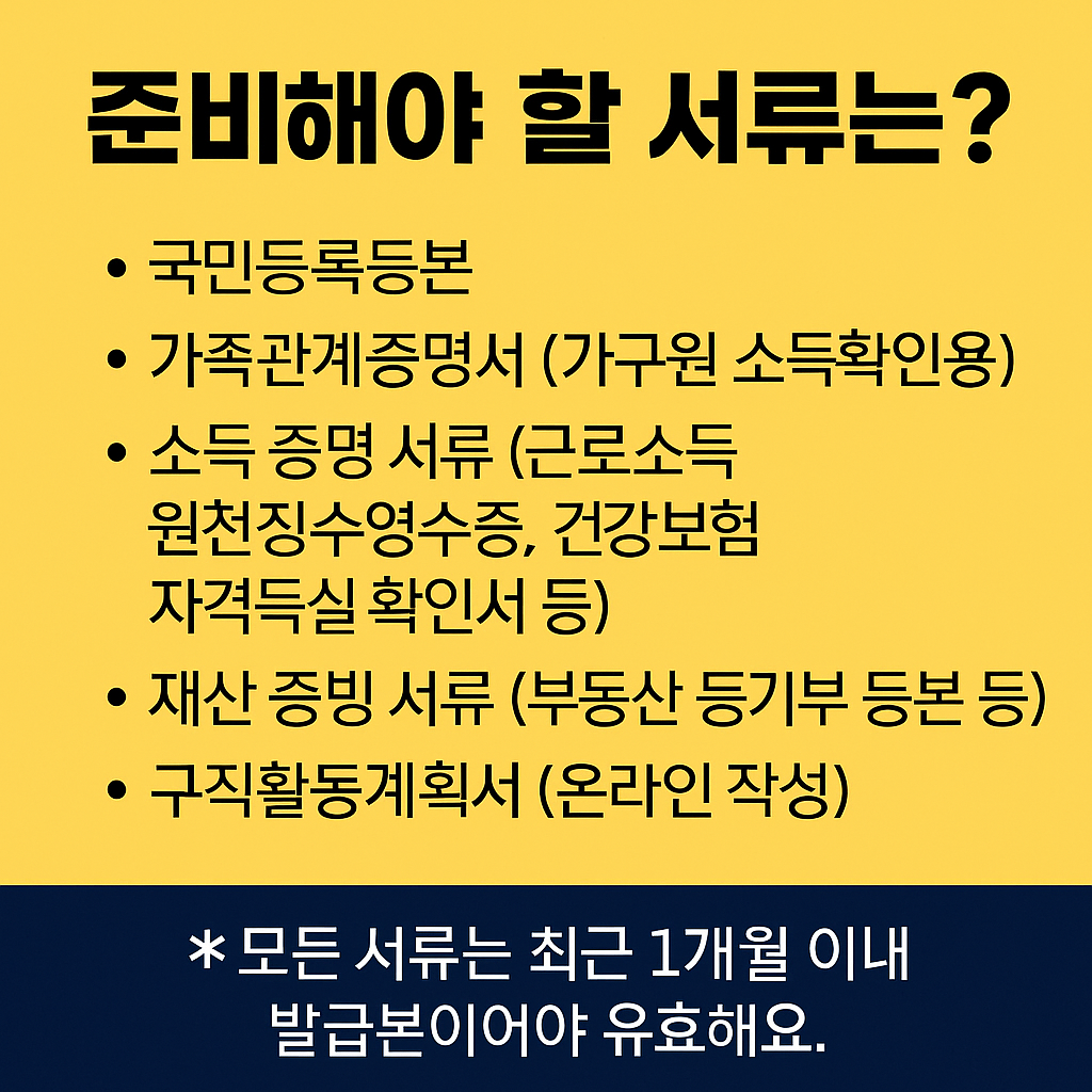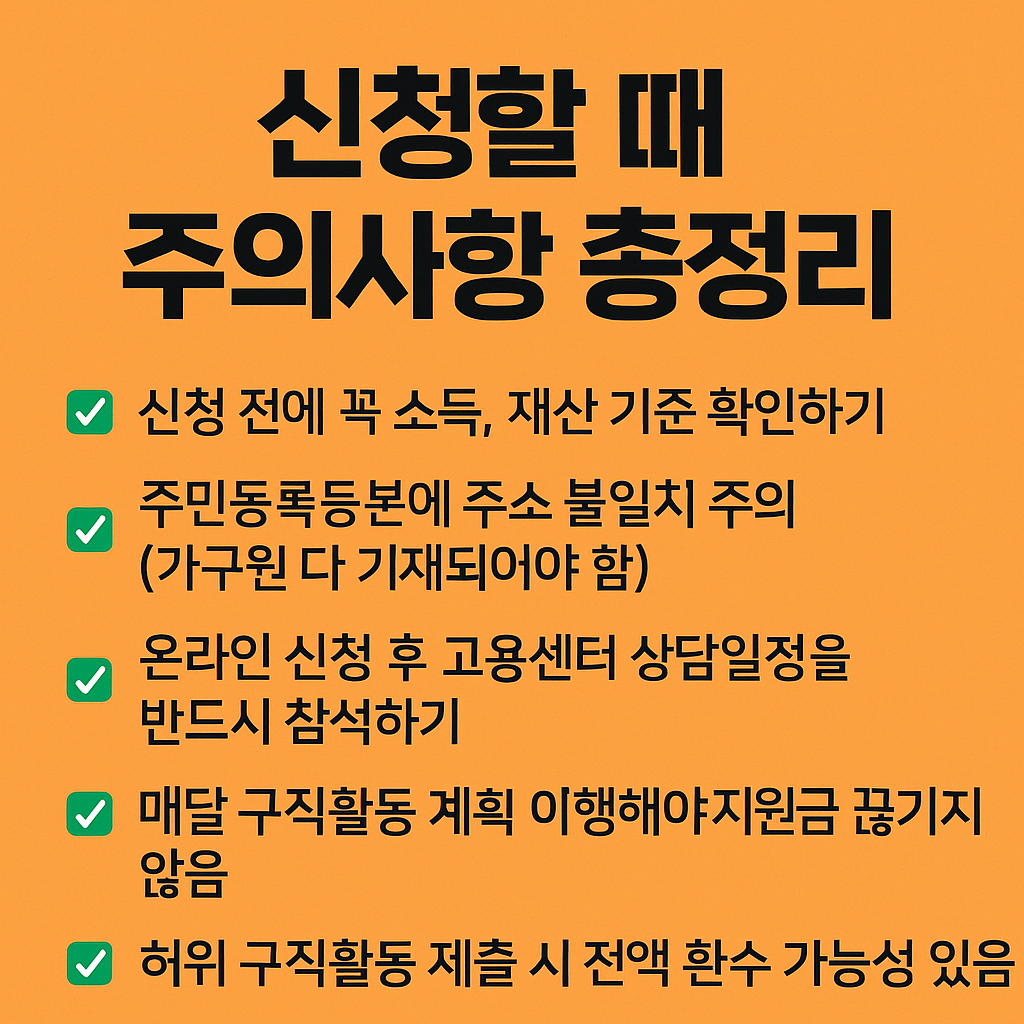 ✅ 신청 전에 꼭 소득, 재산 기준 확인하기 ✅ 주민등록등본에 주소 불일치 주의 (가구원 다 기재되어야 함) ✅ 온라인 신청 후 고용센터 상담일정을 반드시 참석하기 ✅ 매달 구직활동 계획 이행해야 지원금 끊기지 않음 ✅ 허위 구직활동 제출 시 전액 환수 가능성 있음