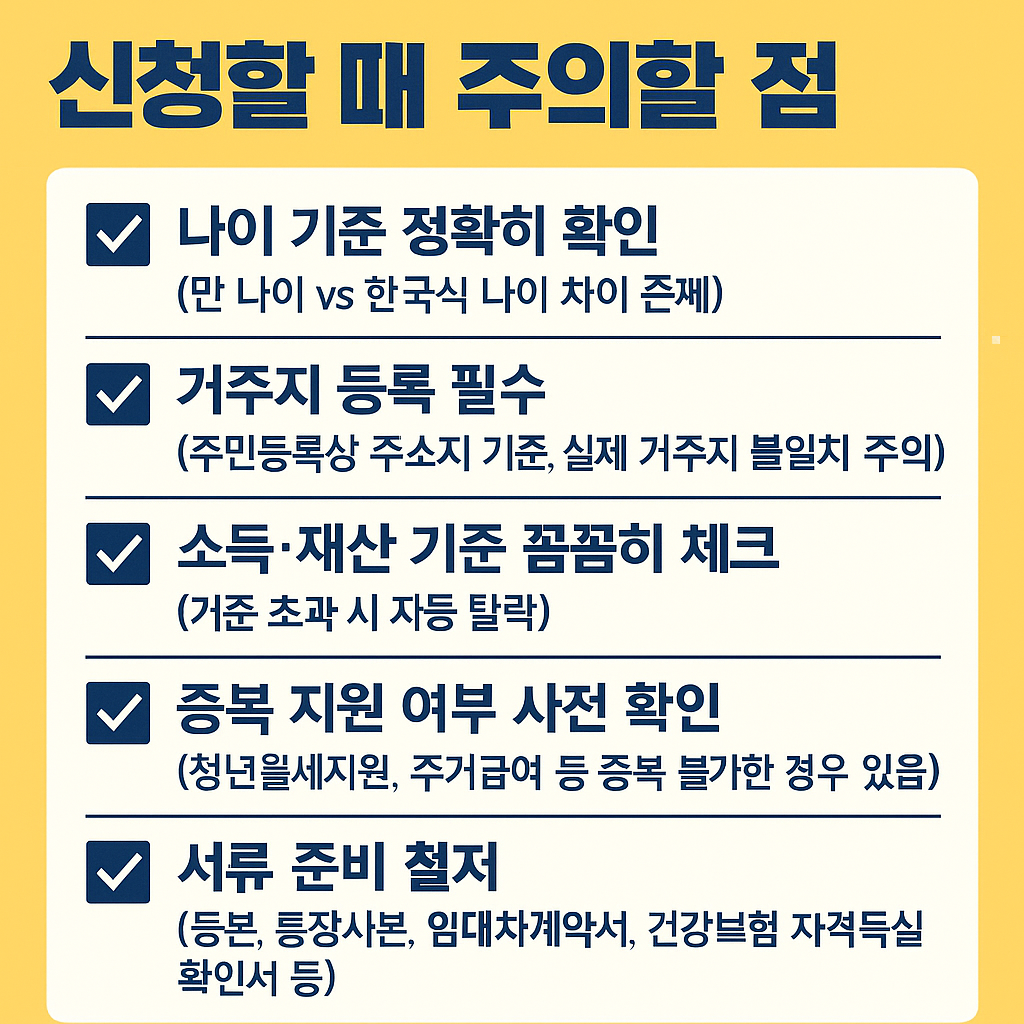 ✔️ **소득·재산 기준 꼼꼼히 체크** (기준 초과 시 자동 탈락)